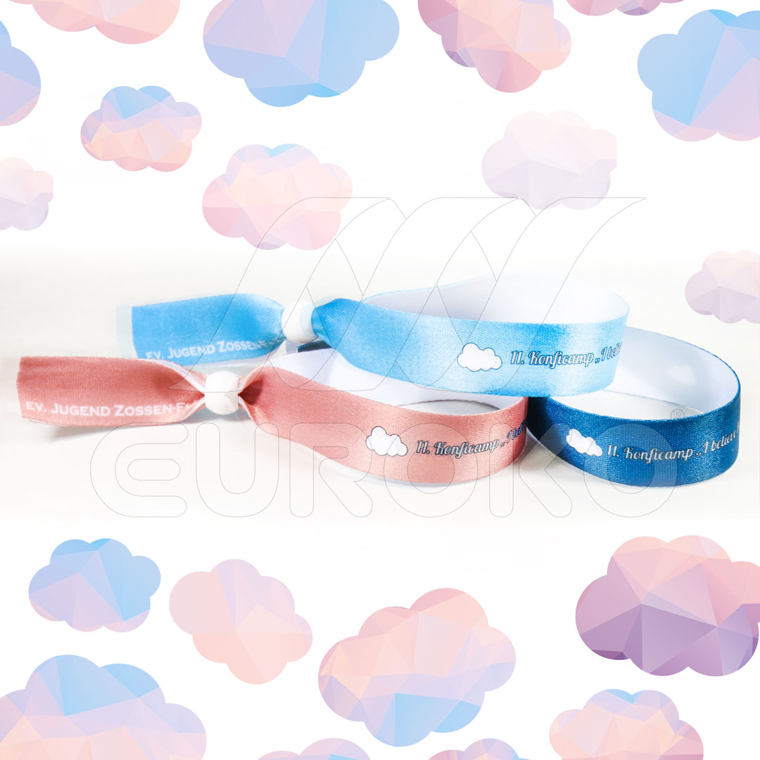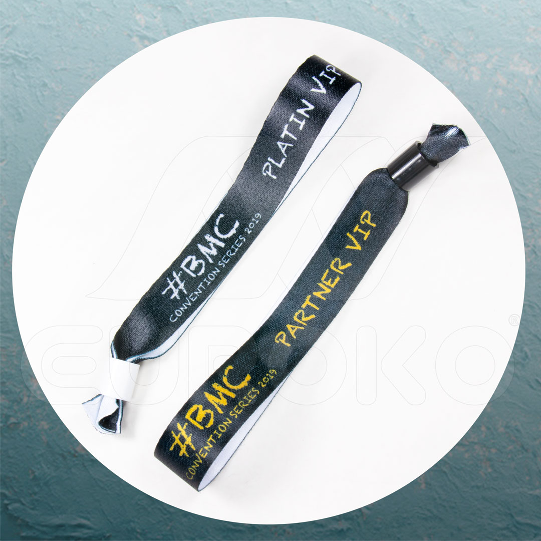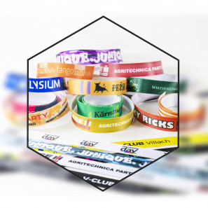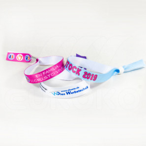 I braccialetti in tessuto sono i più richiesti dagli organizzatori di eventi e feste all'aperto che durano più giorni. Grazie al materiale in poliestere restano durevoli anche nelle condizioni più estreme dei festival. Questo tipo di bracciale è infrangibile, resistente all'umidità, al calore e al freddo. Disponibile in due larghezze; 15 e 20mm.